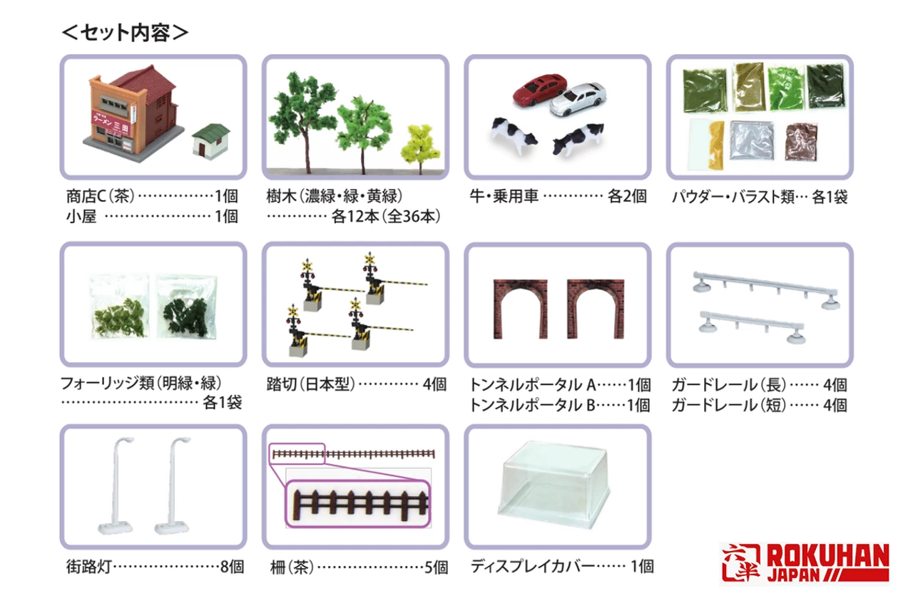 – Small structures such as passenger cars, street lights, cows, and fences that are indispensable for layout are also included.